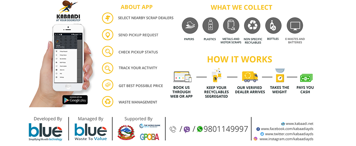 An article was published about Blue Waste Value and Blue Technology's tech startup named Kabaadi at Your Doorstep on Kantipur Daily Hello Sukrabar on 13th July, 2018. It details about the initiative and it's short term as well as long terms goals so as to bring the positive impact on recyclables recovery and its effective management. It is also to promote the source segeration of the waste and to educate the citizen of Kathmandu Valley about recyclables and the best practices to manage them so as to reduce the quantity of recyclables being sent to landfill.