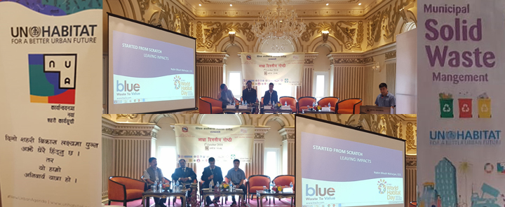 On the occasion of World Habitat Day, 2018, Ministry of Urban Development (MoUD), Department of Urban Development and Building Construction (DUDBC) and UN Habitat jointly organized an event moving forward with the Third United Nations Conference on Housing and Sustainable Urban Development (Habitat III) with a theme "Municipal Solid Waste Management" in Hotel Shanker, Lazimpat. The event saw the large participation of representatives from various sectors like DUDBC, UN Habitat, MoUD, MuAN and various Municipalities, where Blue Waste to value also showed an active presence and participation. Inaugurated by the honorable Minister, Mohammad Estiyak Rai, and presentation and experience sharing from various representatives, the program especially focused on Municipal waste management especially by Kirtipur Municipality, Bhaktapur Municipality, and Waling Municipality. Representing BW2V, Nabin Bikash Maharjan also shared the organizational activities for waste management, BW2V's role to work along SDGs, and presented the works that BW2V does focusing on maximizing the value of waste through various creative activities. He elaborated his presentation stating that Waste Management is done by creating a circular economy with 5 Principles viz. reuse, reduce, recycle, rethink and recovery. This 5 principles of Waste Management is implemented with various projects undertaken by BW2V such as Commercial Waste Management, Community/ Municipal Waste Management, and Waste Specific Projects.