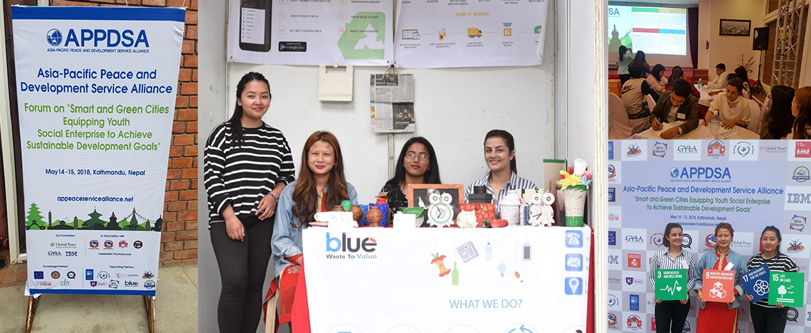 On 14th and 15th May 2018, Asia-Pacific Peace and Development Service Alliance (APPDSA 2018), two days’ workshop on “Moral and Innovative Leadership for Sustainable Development and Kathmandu forum on Green and Smart Cities” was held in Tripureshwor, Kathmandu, Nepal. Jointly Organized by Global Peace Foundation (GPF, Nepal), IBM India and Global Youth Leadership Academy (GYLA), the workshop aimed to develop the moral and innovative leadership for Sustainable Development, empowering youth to achieve Smart and Green Cities. The forum brought together a diverse group of the students, youth leaders, and young professionals from in and out of the country, where BW2V also had taken an active participation as a supporting partner of the entire program. Members of BW2V participated in both the leadership workshop and Kathmandu forum. In addition, BW2V displayed the stall with their products: Kabaadi app at your doorstep, which is an utility mobile application to sell the recyclable waste in systematic way and other handicrafts like paper and plastic products, made out of wastes. Mr. Nabin Bikash Maharjan, CEO of BW2V gave the closing speech at APPDSA sharing his experience of work in the field of waste since last 20 years and also, regarding the engagement of youth in leadership and achieving smart cities.